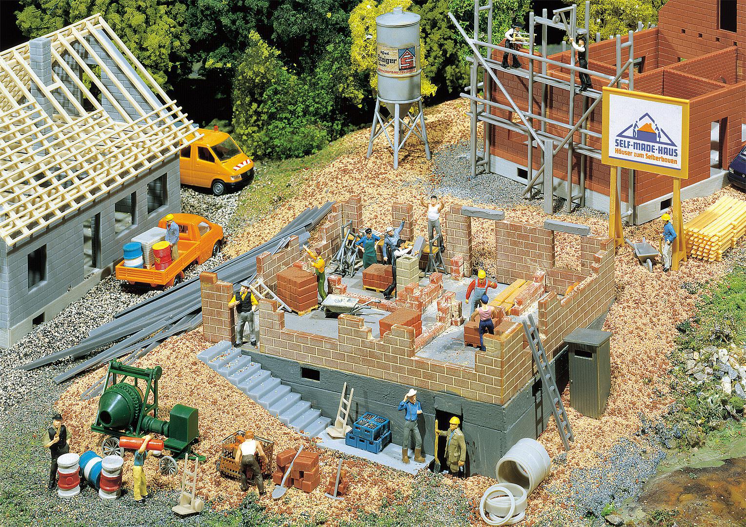 Haus im Bau - Faller 130307. Das Kellerfundament steht bereits und die Außenwände werden nun hochgemauert. Typisches Baustellenzubehör liegt bei. Dieser Bausatz enthält: 161 Einzelteile in 7 Farben, 1 Deko und 1 Bauanleitung. Maße 120 x 106 x 61 mm