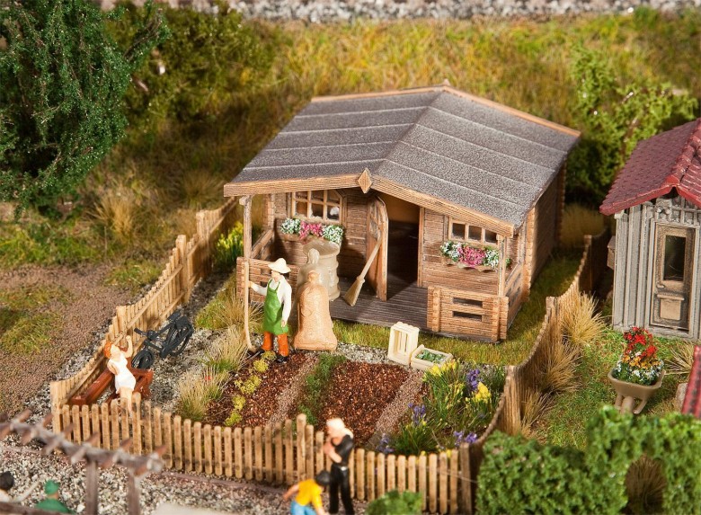 H0 Stall mit Taubenschlag und Pferdeboxen mit abnehmbarem Dach - Vollmer 43726 - Das Dach des Stalls ist abnehmbar. So kann das Innere nach Belieben gestaltet und verändert werden. Maße: L 13,5 x B 8 x H 13,5 cm.