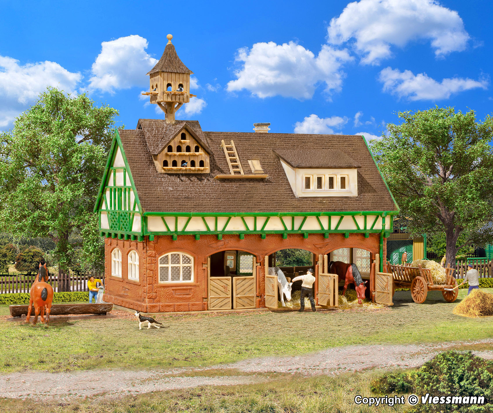 H0 Stall mit Taubenschlag und Pferdeboxen mit abnehmbarem Dach - Vollmer 43726 - Das Dach des Stalls ist abnehmbar. So kann das Innere nach Belieben gestaltet und verändert werden. Maße: L 13,5 x B 8 x H 13,5 cm.